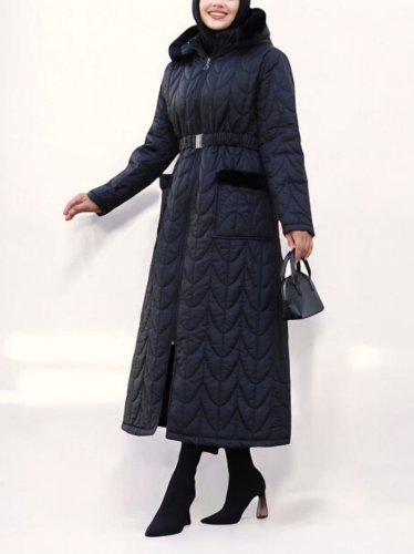 • Kapşonu ve Cebi Peluş Detaylı Lastikli Kemerli Uzun Mont Siyah