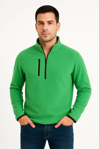 • Erkek Polar Kazak Dik Yaka Yarım Fermuarlı Fermuarlı Göğüs Cepli Siyah Biyeli Kışlık Rahat Regular Fit Günlük Model Yeşil