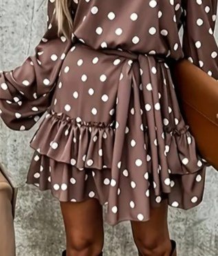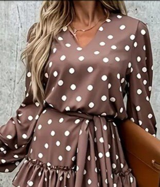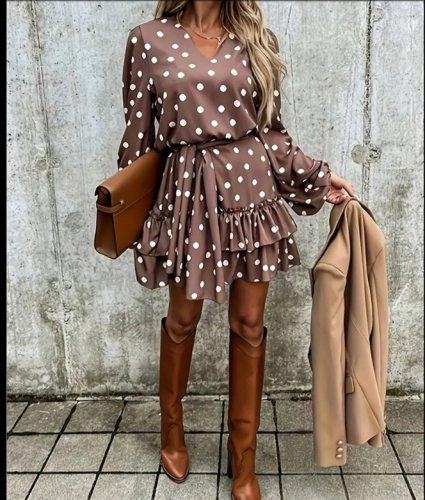 • Kadın uzun kollu v yakalı belden kuşaklı puantiyeli mini modal elbise