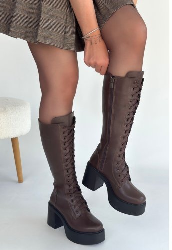 Guay Kahverengi Cilt Bağcıklı Topuklu Çizme