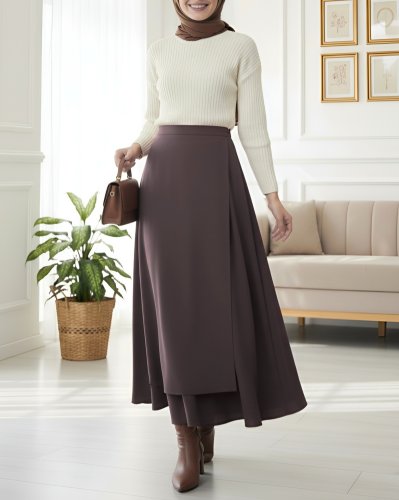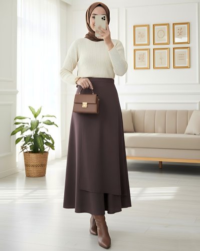 Önü Çapraz Çift Katlı Scuba Etek K Kahve